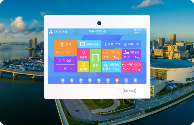以及二氧化碳、甲醛濃度等教室設備環境進行一鍵控制,上課、自習、午休等多種場景模式,